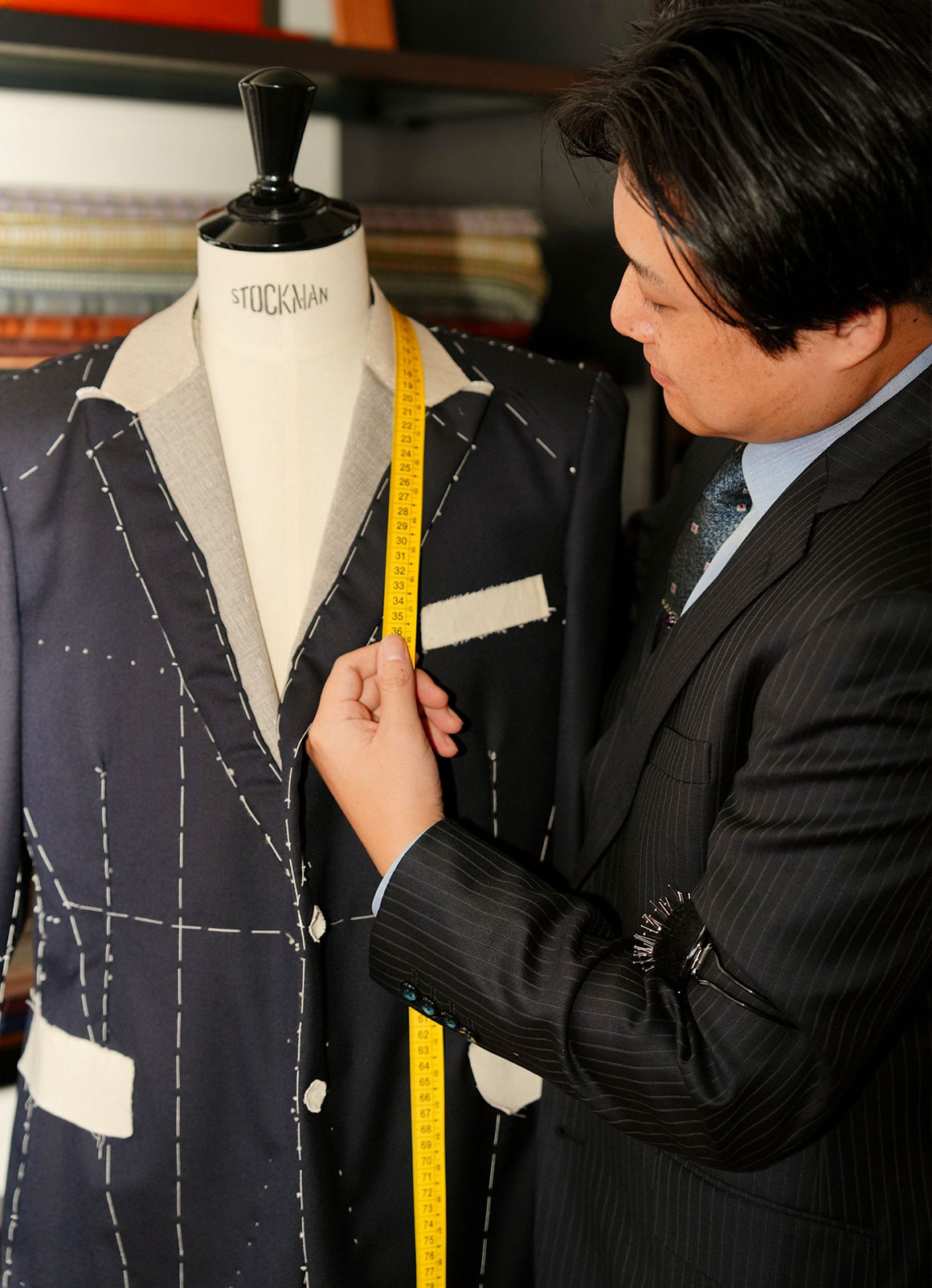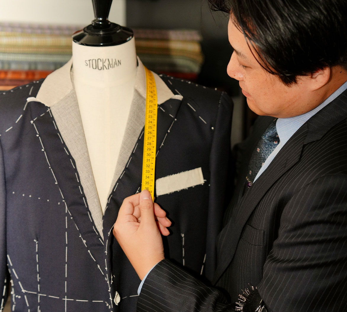 オーダメイドの服づくりには数百以上の作業工程が存在します。松崎のオーダースーツは、創業以来、店舗に隣接する自社アトリエにおける縫製にこだわっています。熟練の職人とスタッフたちが、お客様のすぐ近くで手を動かす環境を整えていること。それは、松崎のスタッフ一人ひとりが、お客様の声をいちばん近くで伺い、どんな細かなご要望にもお応えし、カタチにしていく姿勢の表れです。