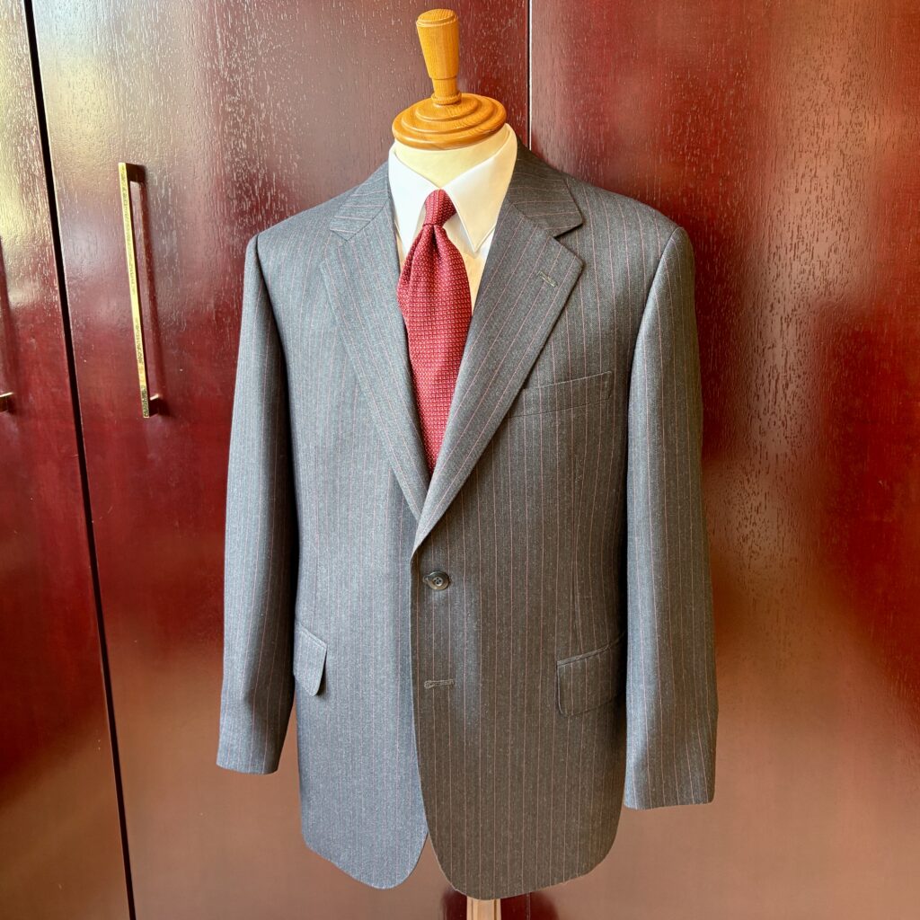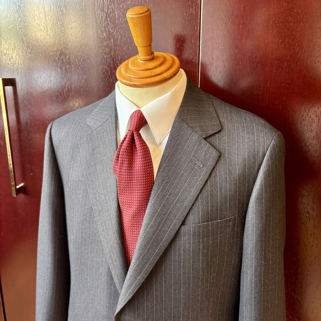 今回のお仕立ては、グレー地にレッドのピンストライプ。